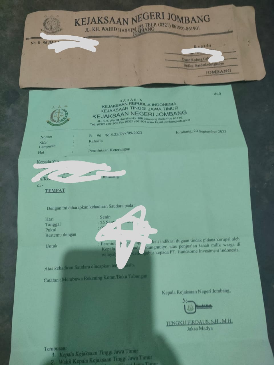 Radarposnusantara.id – Kejaksaan Negeri Kabupaten Jombang melakukan pemanggilan para saksi dan terduga pelaku terkait pembebasan lahan PT Handsome Investment Indonesia dusun kedunggabus Kecamatan Bandarkedungmulyo yang sudah meresahkan masyarakat dan segera memangil dan memeriksa Kepala Desa yang diduga menjadi dalang utama permasalahan tersebut.