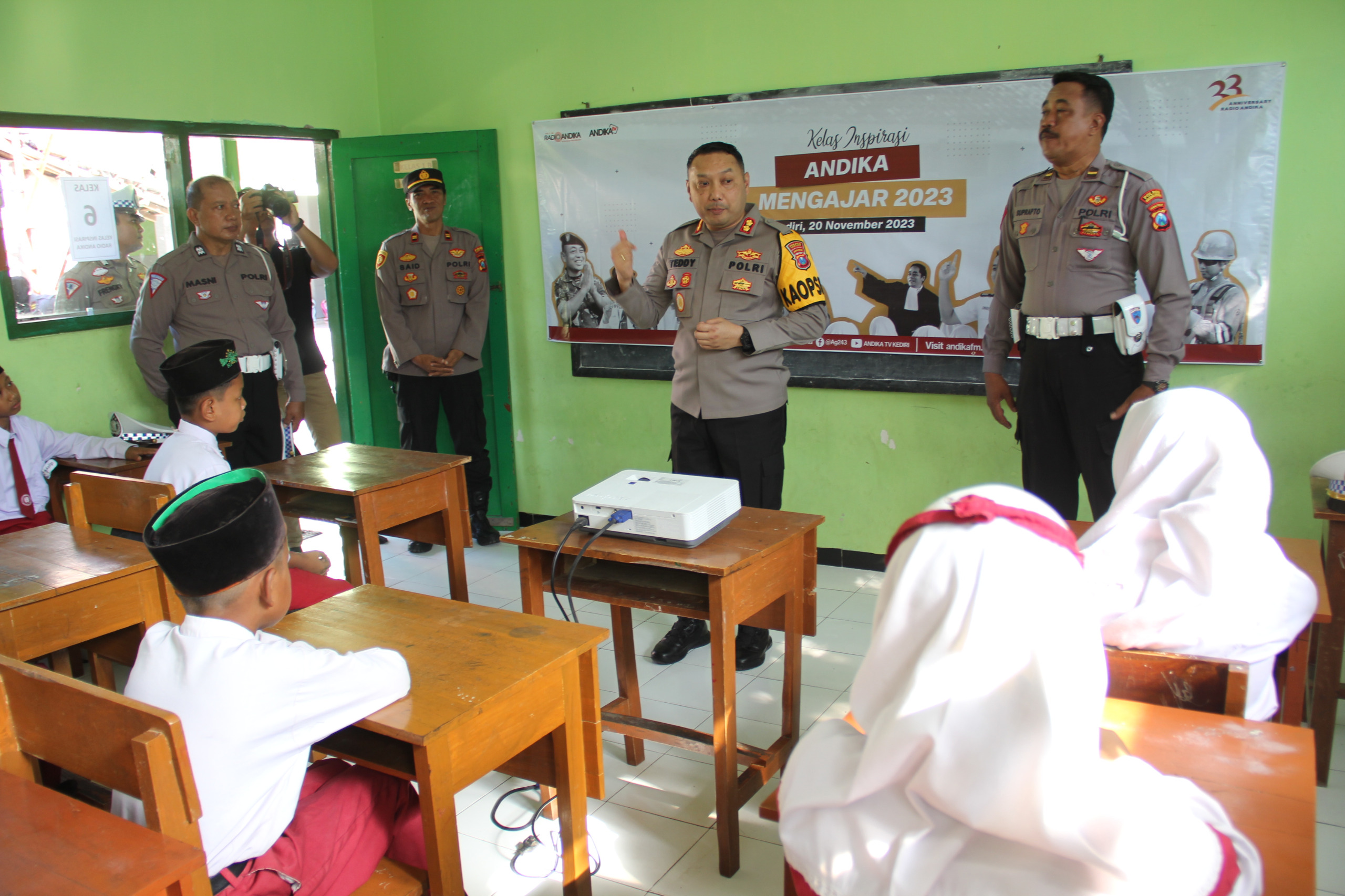 Kapolres Kediri Kota AKBP Teddy Chandra, S.I.K., M.Si. bersama para relawan dari berbagai profesi turun dengan sukarela memberikan motivasi dan semangat kepada siswa siswi dalam kegiatan kelas inspirasi bersama Radio Andika di MI dan MTS Miftahul Afkar di Dsn Selotopeng Ds Banyakan Kab Kediri.