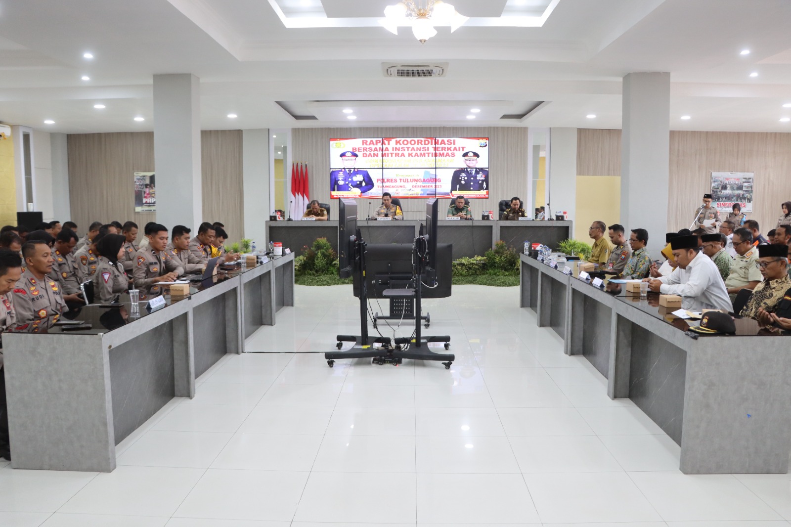 Rapat Koordinasi bersama unsur Forum Komunikasi Pimpinan Daerah (Forkopimda) Tulungagung dan instansi terkait, Tokoh Agama, Tokoh Masyarakat, berlangsung di ruang SAR polres Tulungagung Polda Jatim, Selasa (19/12/2023).